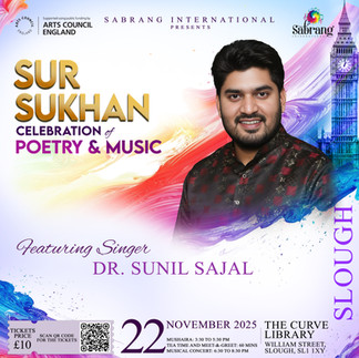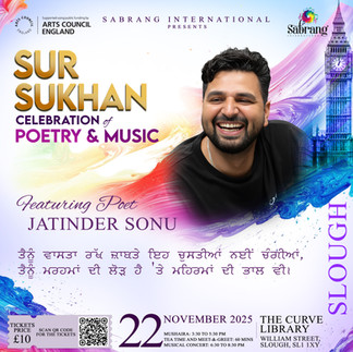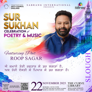 Experience Sur Sukhan – A Celebration of Poetry & Music, a grand cultural evening presented by Sabrang International and supported by the Arts Council England, on 22nd November 2025 at The Curve Library, Slough (SL1 1XY).